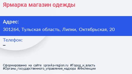 Ярмарка, магазин одежды по адресу 301264, Тульская область, Липки, Октябрьская, 20 в дальнейшем Организация, размещена в следующих категориях: