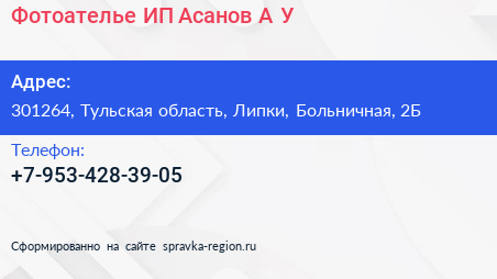 Фотоателье, ИП Асанов А.У. по адресу 301264, Тульская область, Липки, Больничная, 2Б в дальнейшем Организация, размещена в следующих категориях: