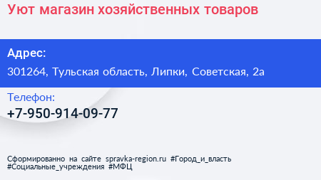 Уют, магазин хозяйственных товаров по адресу 301264, Тульская область, Липки, Советская, 2а в дальнейшем Организация, размещена в следующих категориях: