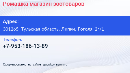 Ромашка, магазин зоотоваров по адресу 301265, Тульская область, Липки, Гоголя, 2г/1 в дальнейшем Организация, размещена в следующих категориях: