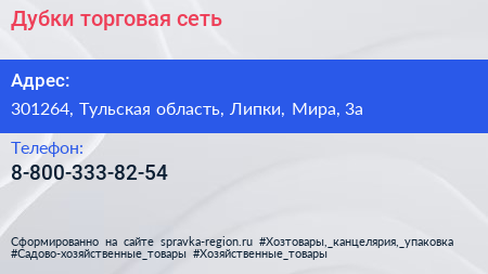 Дубки, торговая сеть по адресу 301264, Тульская область, Липки, Мира, 3а в дальнейшем Организация, размещена в следующих категориях: