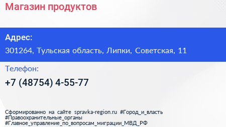 Магазин продуктов по адресу 301264, Тульская область, Липки, Советская, 11 в дальнейшем Организация, размещена в следующих категориях: