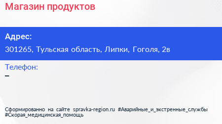 Магазин продуктов по адресу 301265, Тульская область, Липки, Гоголя, 2в в дальнейшем Организация, размещена в следующих категориях: