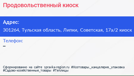 Продовольственный киоск по адресу 301264, Тульская область, Липки, Советская, 17а/2 киоск в дальнейшем Организация, размещена в следующих категориях: