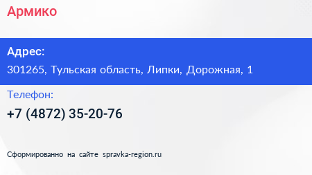 Армико по адресу 301265, Тульская область, Липки, Дорожная, 1 в дальнейшем Организация, размещена в следующих категориях: