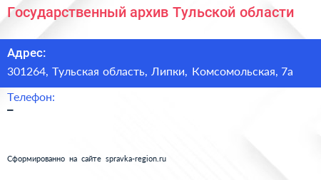 Государственный архив Тульской области по адресу 301264, Тульская область, Липки, Комсомольская, 7а в дальнейшем Организация, размещена в следующих категориях: