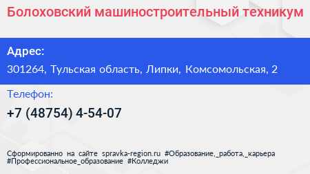 Болоховский машиностроительный техникум по адресу 301264, Тульская область, Липки, Комсомольская, 2 в дальнейшем Организация, размещена в следующих категориях: