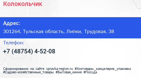 Колокольчик по адресу 301264, Тульская область, Липки, Трудовая, 38 в дальнейшем Организация, размещена в следующих категориях: