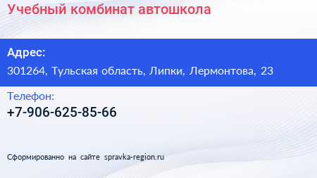 Учебный комбинат, автошкола по адресу 301264, Тульская область, Липки, Лермонтова, 23 в дальнейшем Организация, размещена в следующих категориях:
