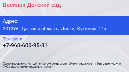 Василек, Детский сад по адресу 301296, Тульская область, Липки, Кутузова, 14а в дальнейшем Организация, размещена в следующих категориях: