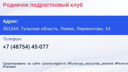 Родничок, подростковый клуб по адресу 301264, Тульская область, Липки, Лермонтова, 14 в дальнейшем Организация, размещена в следующих категориях: