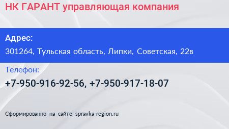 НК-ГАРАНТ, управляющая компания по адресу 301264, Тульская область, Липки, Советская, 22в в дальнейшем Организация, размещена в следующих категориях: