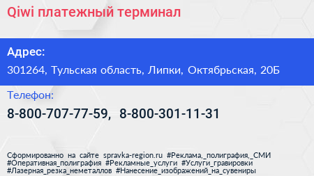 Qiwi, платежный терминал по адресу 301264, Тульская область, Липки, Октябрьская, 20Б в дальнейшем Организация, размещена в следующих категориях: