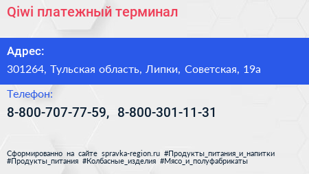Qiwi, платежный терминал по адресу 301264, Тульская область, Липки, Советская, 19а в дальнейшем Организация, размещена в следующих категориях: