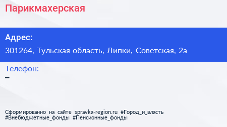Парикмахерская по адресу 301264, Тульская область, Липки, Советская, 2а в дальнейшем Организация, размещена в следующих категориях: