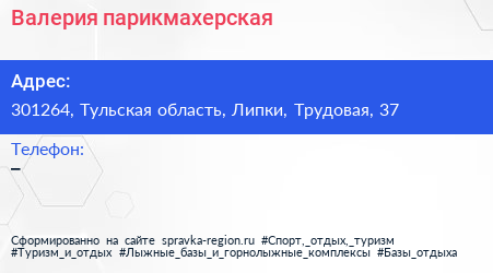 Валерия, парикмахерская по адресу 301264, Тульская область, Липки, Трудовая, 37 в дальнейшем Организация, размещена в следующих категориях: