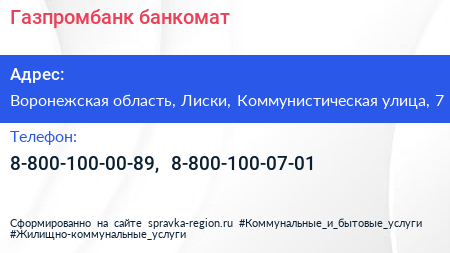 Газпромбанк, банкомат по адресу Воронежская область, Лиски, Коммунистическая улица, 7 в дальнейшем Организация, размещена в следующих категориях: