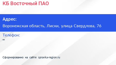 КБ Восточный, ПАО по адресу Воронежская область, Лиски, улица Свердлова, 76 в дальнейшем Организация, размещена в следующих категориях: