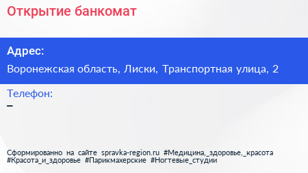 Открытие, банкомат по адресу Воронежская область, Лиски, Транспортная улица, 2 в дальнейшем Организация, размещена в следующих категориях: