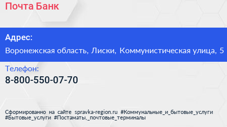 Почта Банк по адресу Воронежская область, Лиски, Коммунистическая улица, 5 в дальнейшем Организация, размещена в следующих категориях:
