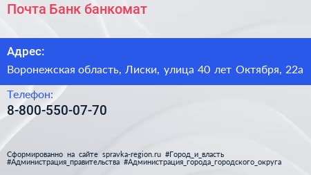 Почта Банк, банкомат по адресу Воронежская область, Лиски, улица 40 лет Октября, 22а в дальнейшем Организация, размещена в следующих категориях:
