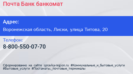 Почта Банк, банкомат по адресу Воронежская область, Лиски, улица Титова, 20 в дальнейшем Организация, размещена в следующих категориях: