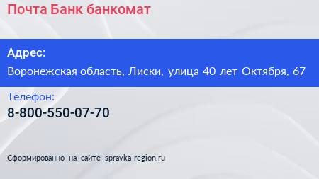 Почта Банк, банкомат по адресу Воронежская область, Лиски, улица 40 лет Октября, 67 в дальнейшем Организация, размещена в следующих категориях: