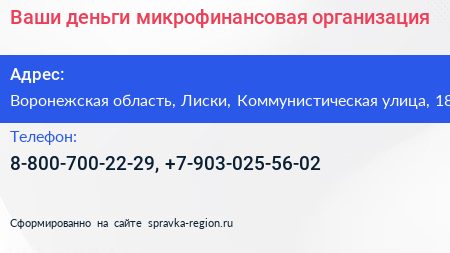 Ваши деньги, микрофинансовая организация по адресу Воронежская область, Лиски, Коммунистическая улица, 18 в дальнейшем Организация, размещена в следующих категориях: