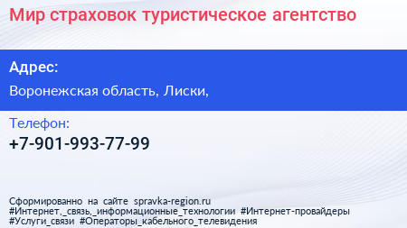 Мир страховок, туристическое агентство по адресу Воронежская область, Лиски, в дальнейшем Организация, размещена в следующих категориях: