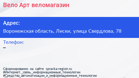 Вело Арт, веломагазин по адресу Воронежская область, Лиски, улица Свердлова, 78 в дальнейшем Организация, размещена в следующих категориях: