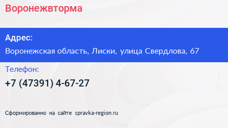 Воронежвторма по адресу Воронежская область, Лиски, улица Свердлова, 67 в дальнейшем Организация, размещена в следующих категориях: