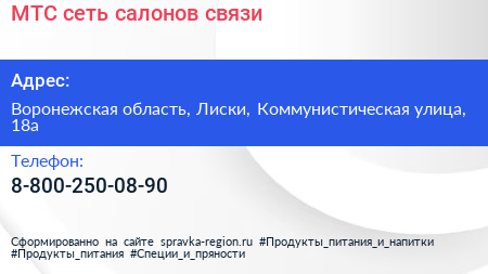 МТС, сеть салонов связи по адресу Воронежская область, Лиски, Коммунистическая улица, 18а в дальнейшем Организация, размещена в следующих категориях: