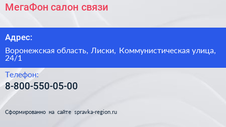 МегаФон, салон связи по адресу Воронежская область, Лиски, Коммунистическая улица, 24/1 в дальнейшем Организация, размещена в следующих категориях: