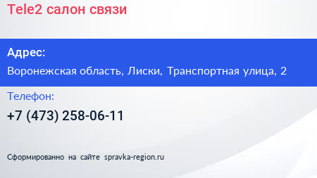Tele2, салон связи по адресу Воронежская область, Лиски, Транспортная улица, 2 в дальнейшем Организация, размещена в следующих категориях: