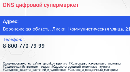 DNS, цифровой супермаркет по адресу Воронежская область, Лиски, Коммунистическая улица, 21 в дальнейшем Организация, размещена в следующих категориях: