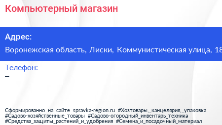 Компьютерный магазин по адресу Воронежская область, Лиски, Коммунистическая улица, 18 в дальнейшем Организация, размещена в следующих категориях: