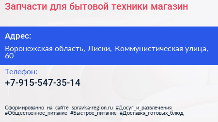 Запчасти для бытовой техники, магазин по адресу Воронежская область, Лиски, Коммунистическая улица, 60 в дальнейшем Организация, размещена в следующих категориях: