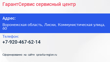 ГарантСервис, сервисный центр по адресу Воронежская область, Лиски, Коммунистическая улица, 60 в дальнейшем Организация, размещена в следующих категориях: