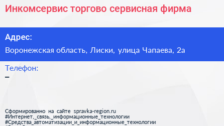 Инкомсервис, торгово-сервисная фирма по адресу Воронежская область, Лиски, улица Чапаева, 2а в дальнейшем Организация, размещена в следующих категориях: