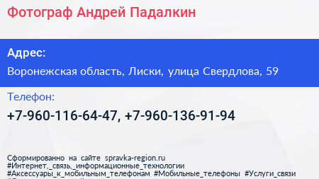 Фотограф Андрей Падалкин по адресу Воронежская область, Лиски, улица Свердлова, 59 в дальнейшем Организация, размещена в следующих категориях: