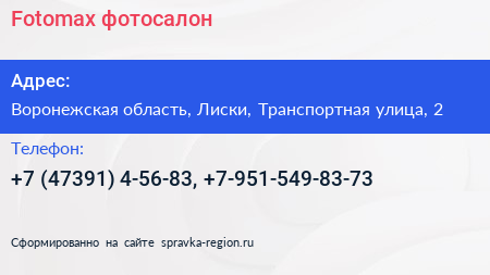 Fotomax, фотосалон по адресу Воронежская область, Лиски, Транспортная улица, 2 в дальнейшем Организация, размещена в следующих категориях: