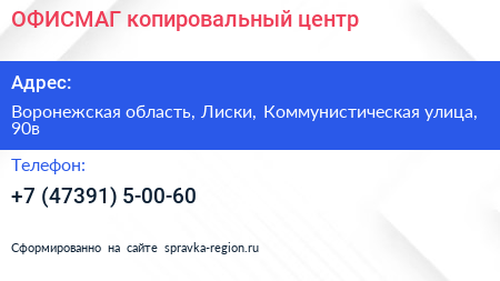 ОФИСМАГ, копировальный центр по адресу Воронежская область, Лиски, Коммунистическая улица, 90в в дальнейшем Организация, размещена в следующих категориях: