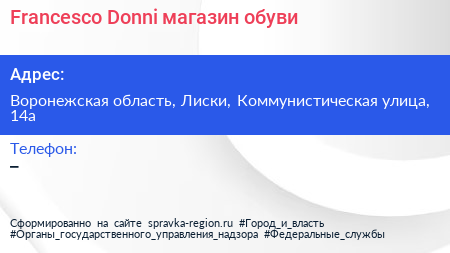 Francesco Donni, магазин обуви по адресу Воронежская область, Лиски, Коммунистическая улица, 14а в дальнейшем Организация, размещена в следующих категориях: