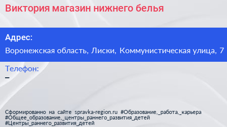 Виктория, магазин нижнего белья по адресу Воронежская область, Лиски, Коммунистическая улица, 7 в дальнейшем Организация, размещена в следующих категориях: