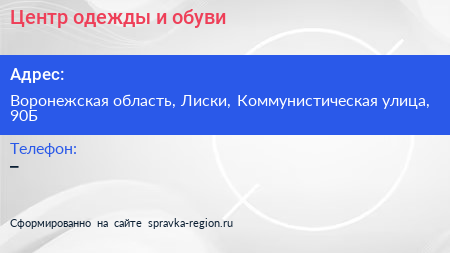 Центр одежды и обуви по адресу Воронежская область, Лиски, Коммунистическая улица, 90Б в дальнейшем Организация, размещена в следующих категориях: