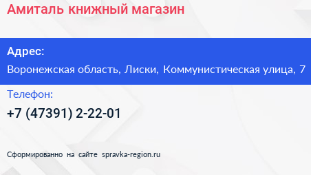 Амиталь, книжный магазин по адресу Воронежская область, Лиски, Коммунистическая улица, 7 в дальнейшем Организация, размещена в следующих категориях: