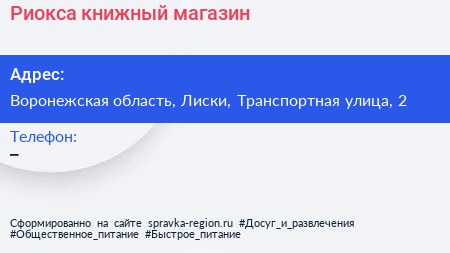 Риокса, книжный магазин по адресу Воронежская область, Лиски, Транспортная улица, 2 в дальнейшем Организация, размещена в следующих категориях: