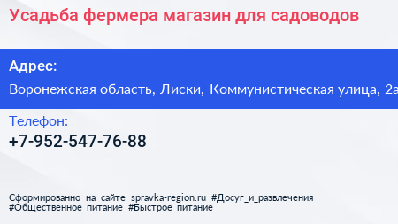 Усадьба фермера, магазин для садоводов по адресу Воронежская область, Лиски, Коммунистическая улица, 2а в дальнейшем Организация, размещена в следующих категориях: