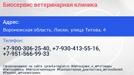 Биосервис, ветеринарная клиника по адресу Воронежская область, Лиски, улица Титова, 4 в дальнейшем Организация, размещена в следующих категориях: