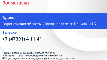 Зоомагазин по адресу Воронежская область, Лиски, проспект Ленина, 41Б в дальнейшем Организация, размещена в следующих категориях: